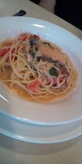 パスタは自家製スモークサーモンとフレッシュトマトのパスタ。