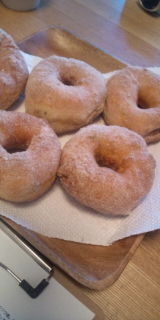 プレーンのドーナッツにはバニラシュガー、レーズンドーナッツにはシナモンシュガーをまぶしてます(*^。^*)